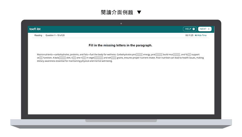 單字填空、生活式閱讀、學術文章等題組,最多約 50 題 考試時間約 30 分鐘 |